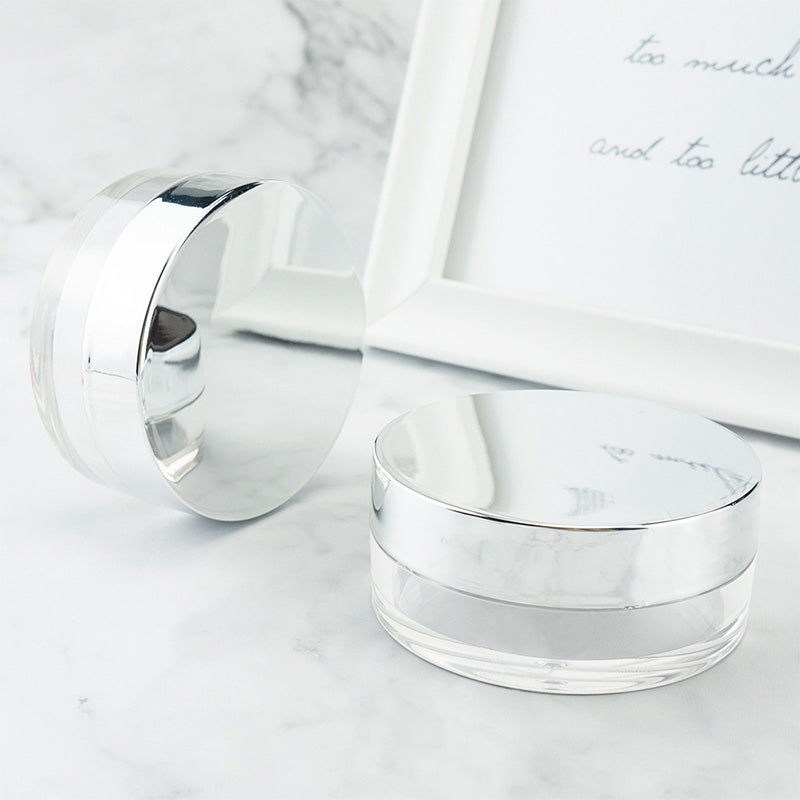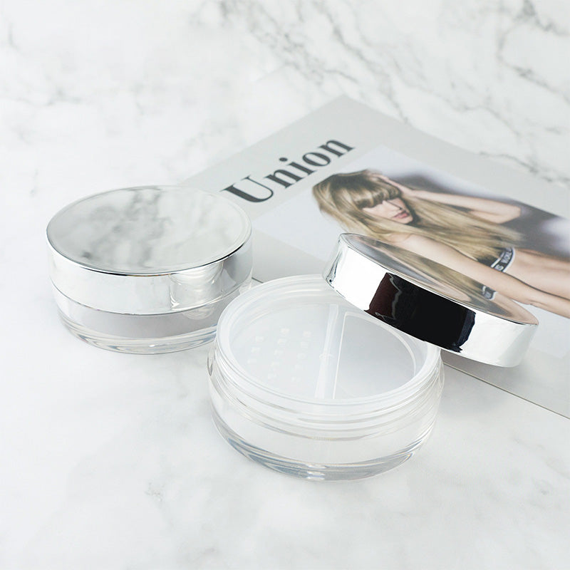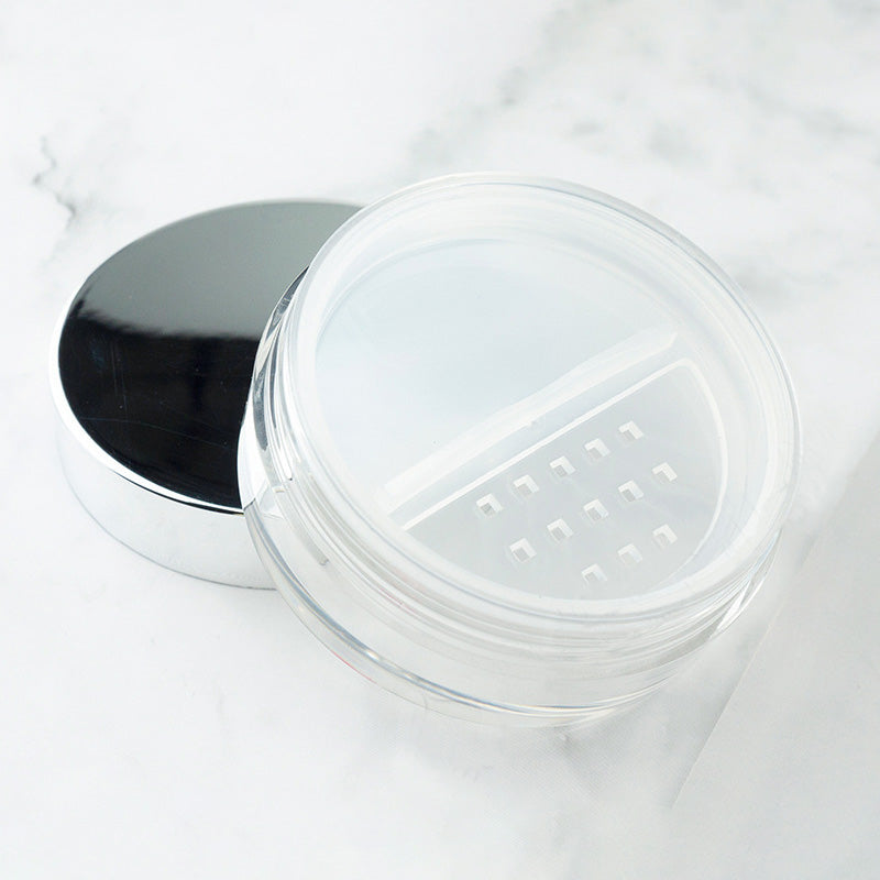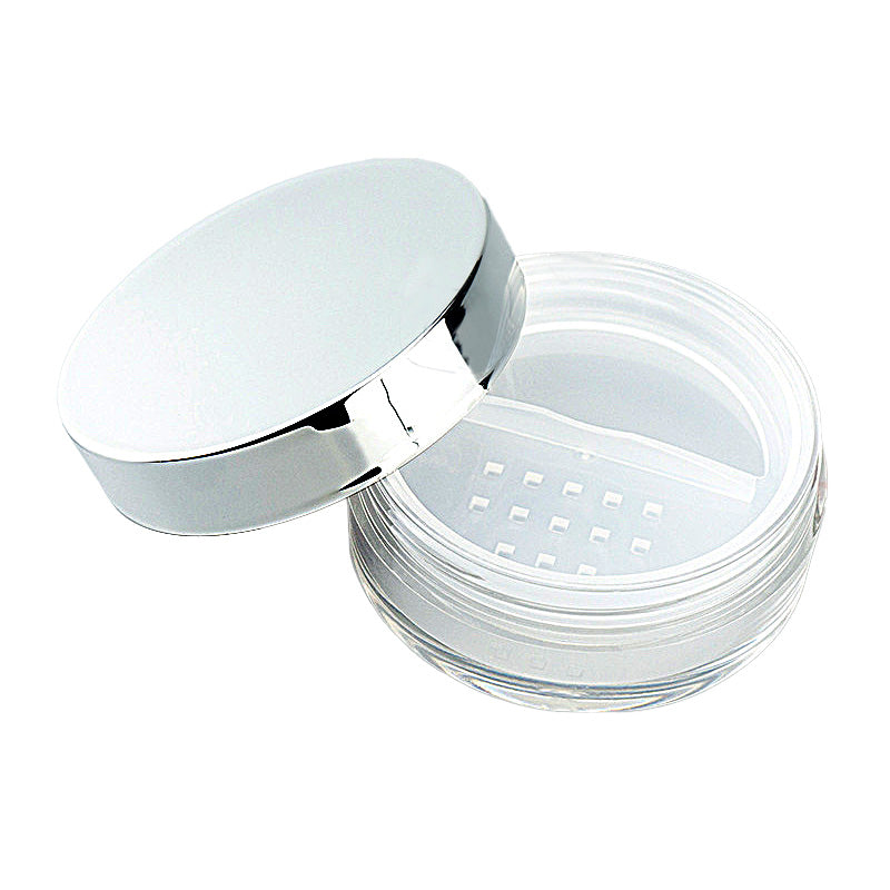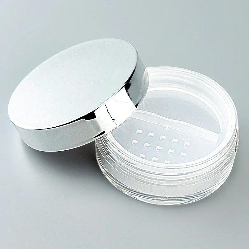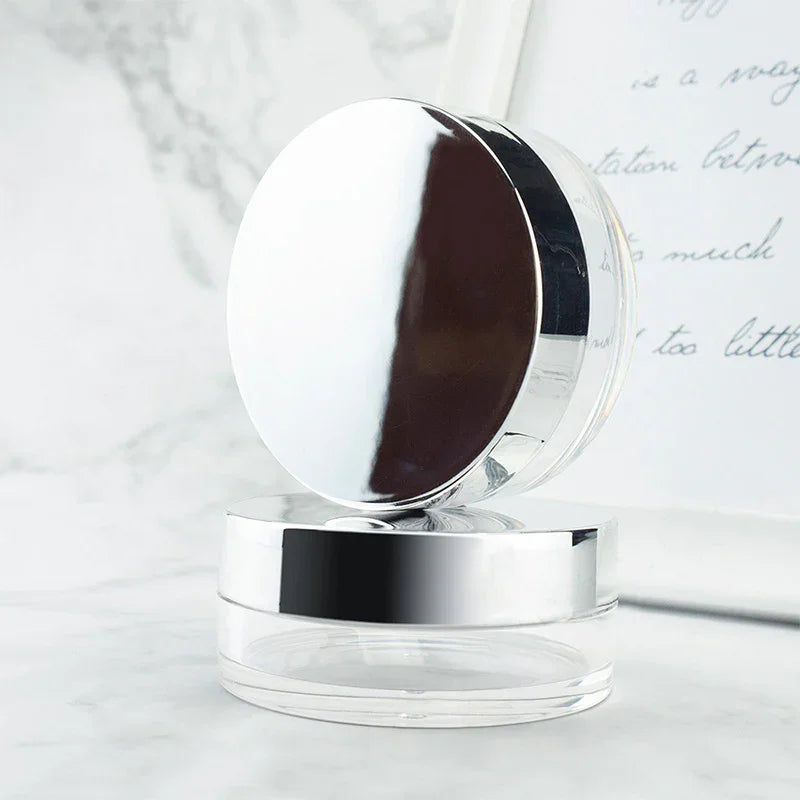 This premium plastic loose powder jar is designed for both practicality and brand customization. The rotating sifter lid allows controlled powder dispensing, reducing waste and mess. Its mirror-finish top can be plated or printed with your logo, giving a professional and high-end appearance. The transparent base lets you easily check product levels at a glance. Perfect for OEM, private label, and professional cosmetic packaging, combining functionality with sleek, modern design.