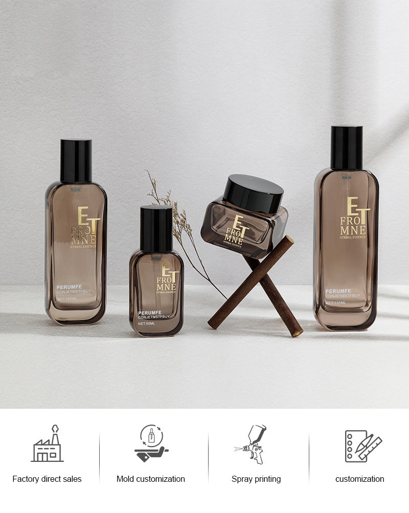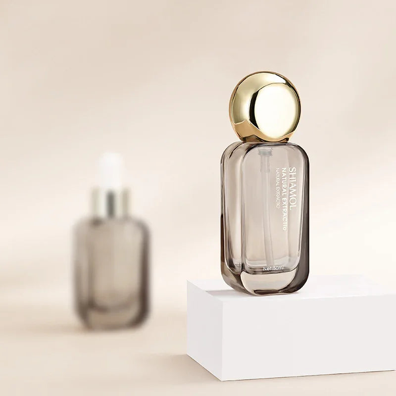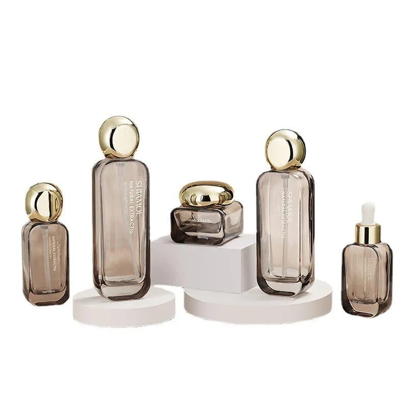 Each piece is crafted from high-grade thick glass, providing a weighty, premium feel that instantly elevates your skincare presentation. The smoky transparent finish adds depth and mystery, while the gold electroplated caps bring a modern yet timeless sense of luxury.