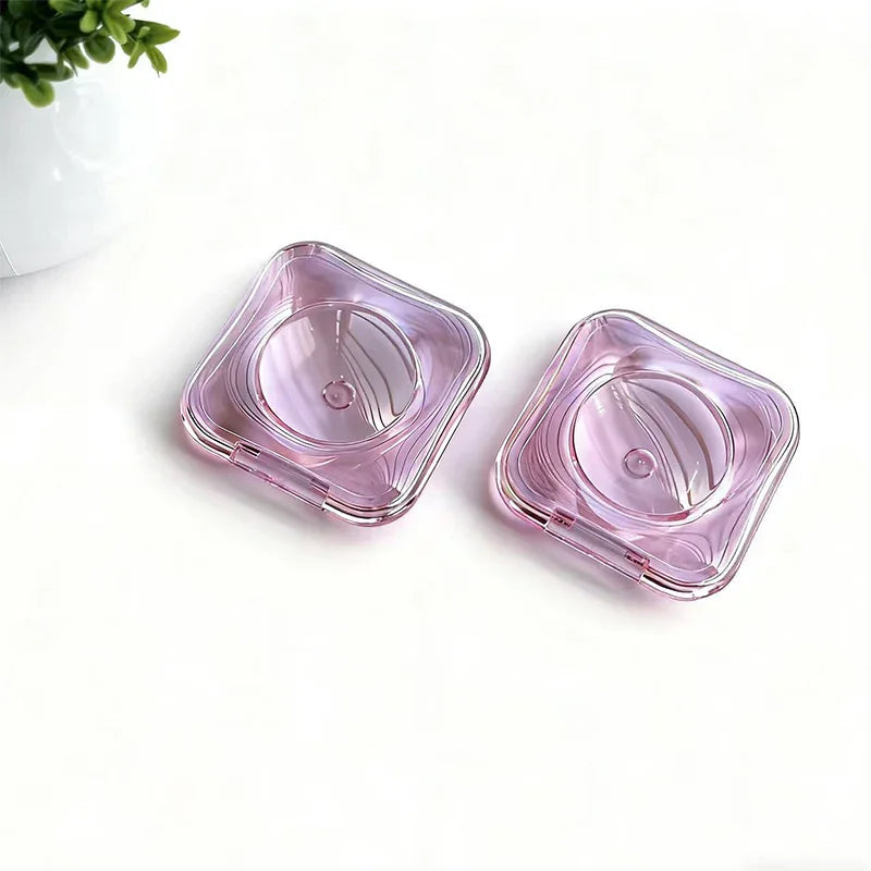 This transparent cosmetic compact is designed for blush, highlighter, and eyeshadow packaging. Featuring a modern clear appearance with a flip-top hinged lid and a round inner pan, it offers both functionality and visual appeal.